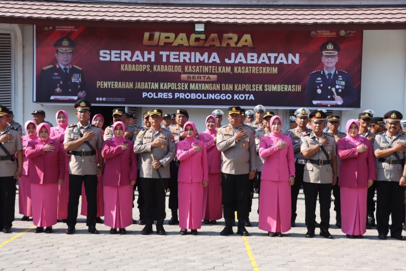 PROBOLINGGO – Kapolres Probolinggo Kota AKBP Wadi Sa’bani S.H.,S.I.K. Memimpin upacara serah terima jabatan Serah Terima Jabatan Kabagops, Kabaglog, Kasat Intelkam, Kasat Reskrim, serta Penyerahan jabatan Kapolsek Mayangan dan Kapolsek Sumberasih, jumat (29/09/23).
